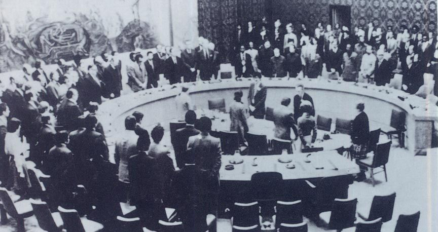1976年1月12日,聯(lián)合國(guó)安全理事會(huì)成員國(guó)代表和觀察員開(kāi)會(huì)時(shí),為周恩來(lái)的逝世默哀。
