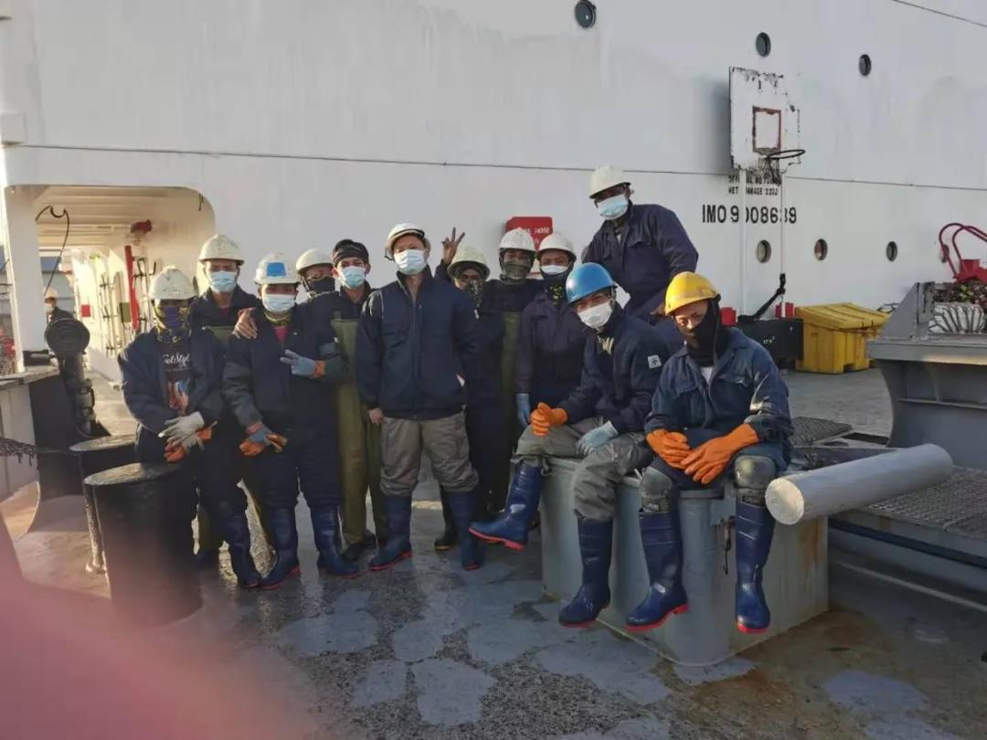 在船員換班變得異常艱難的困難條件下,中魯海運已在去年底完成了第一批超期服役的船員換班工作,極大地緩解了船員的心理壓力。但由于港口換班條件苛刻,也讓公司部分船舶的工作配員沒有達到100%,如“新懋達”輪沒有配足工作級船員,無形之中增加了現有船員的工作負擔和難度,尤其是疫情港口國限制,船舶港內錨泊作業變為漂航轉載時表現得更為明顯,同時與兩艘漁船轉載又讓船員們雪上加霜,由于大部分船員都是第一次參加下艙轉載,加之外籍船員居多,一時間很難適應艙內寒氣,高強度工作過后渾身酸痛、扒載護具穿戴慢、艙內轉載工作效率低下等等情況嚴重地影響了裝貨進度。在此情況下,他們從早上7點開工到第二天凌晨收工來追趕每天的裝貨進度,下艙人員睡眠和休息時間每天僅僅4-5個小時,面對這種情況,船長宋曉亮挺身而出,沖在了一線,一些不需要參加下艙扒載工作的人員緊隨其后,與時間賽跑、與質量并行,終于在半個月內按期完成了轉載任務,贏得了贊譽。