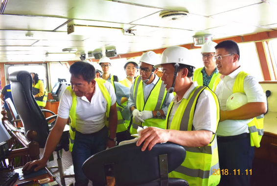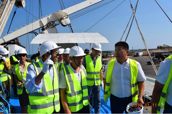 2018年11月11日下午,農業農村部考察團在屈部長的帶領下以及中國駐加納大使館王大使的陪同下來到了特馬漁港碼頭,在加納代表處首席代表孫忠海及遠洋漁業協會相關負責人的陪同下,登上了我大型金槍魚圍網船“大西洋王子號”調研考察。在駕駛艙內,“大西洋王子號”船長向屈部長及王大使一行詳細介紹了駕駛艙內各項先進的現在化作業儀器設備。隨后,考察團一行又進入船艙內了解漁獲生產情況,在了解到目前船只捕魚情況良好,漁獲規格大、質量好的時候,屈部長對中魯公司在加納金槍魚圍網項目的發展表示了充分的肯定。