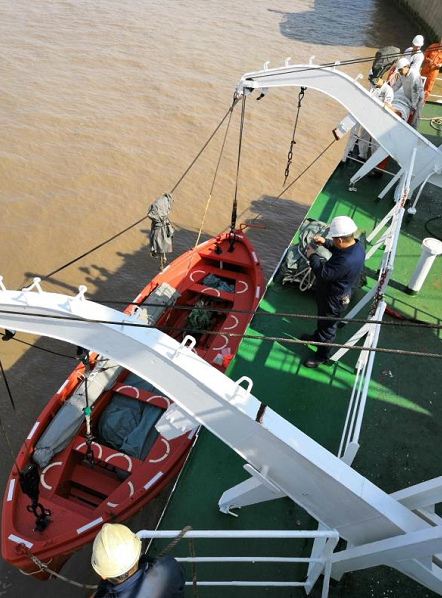 圖為岸基人員正在檢查救生艇的保養狀況,做好船舶備檢工作。