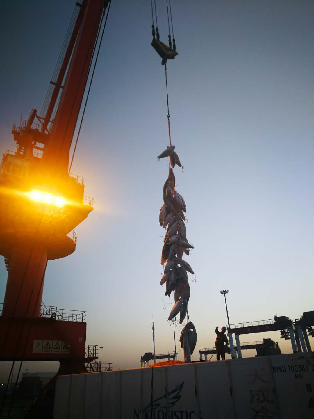 卸魚工作看似簡單,但越是簡單的工作越需要認真對待。在碼頭前沿卸貨,首要的便是保證人員安全和貨物安全,不能出一絲紕漏,考驗耐性、眼力和責任心。通過多次順利執行卸貨任務,中魯海延員工總結出了魚貨卸載的“三字訣”。首先要“穩”,要及時與在船人員做好溝通協調,切實落實各項準備工作和全部流程節點;其次要“準”,公司經營的魚貨種類繁多,必須要確保分好魚種,過磅計量一絲不茍,計數精準;在保證安全與質量的同時,第三就是要做到“快”,各環節嚴守崗位無縫對接,有效提高作業效率,節省卸魚時間,從而實現利益的最大化。