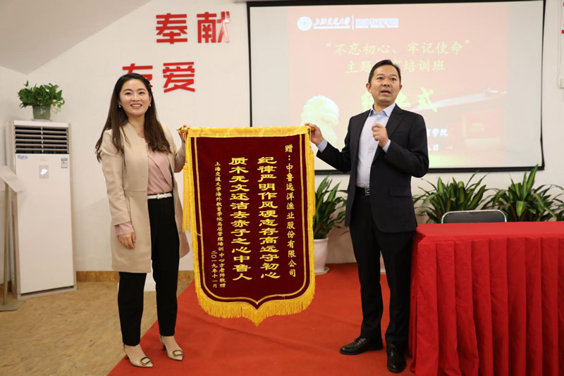 在結業典禮上,上海交通大學培訓項目負責人方丹老師為每位學員發放了“結業證書”,對全體學員順利結業表示祝賀,真誠邀請全體學員有機會再來交大學習交流。公司領導對上海交大的精心組織和真誠服務表示感謝。方丹老師為中魯遠洋公司培訓班贈送了“紀律嚴明作風硬志存高遠守初心、質木無文還潔去赤子之心中魯人”的錦旗,高度贊揚了中魯遠洋公司的學習精神和學習態度。