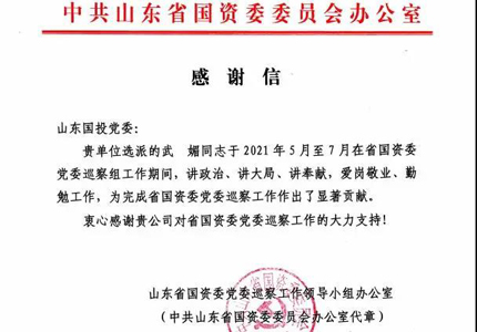 近日,山東省國資委黨委辦公室向山東國投公司發去感謝信,感謝中魯遠洋公司財務部門員工武媚同志在借調省國資委黨委巡察組工作期間,愛崗敬業,勤...