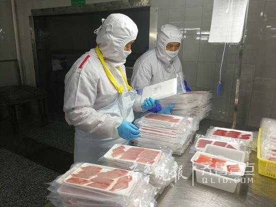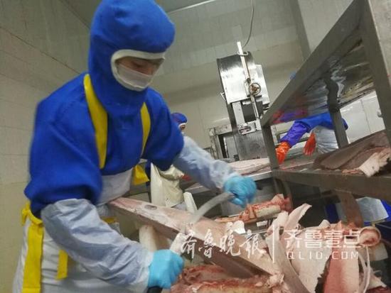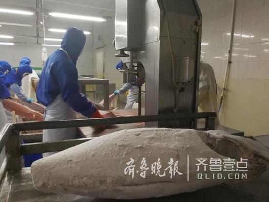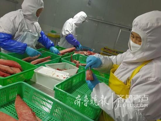 11日上午,在山東省中魯遠(yuǎn)洋(煙臺)食品有限公司的加工車間,工人們在緊張而有序 的忙碌著,一條條超低溫冷凍的金槍魚被經(jīng)過去頭、去皮、去刺、切斷、切片、稱重...... 一系列的加工流程之后,一盒盒的美味佳肴、金槍魚生魚片出爐了,并出口到日本、歐洲等 各國。