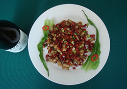 麻辣魚筋 原料:魚筋300克,黃豆芽200克; 調(diào)味料:郫縣豆瓣50克,鮮花椒粒25克,火鍋底料20克,芝麻油10克,白砂糖少許,姜片、蔥花適量,火鍋老油10